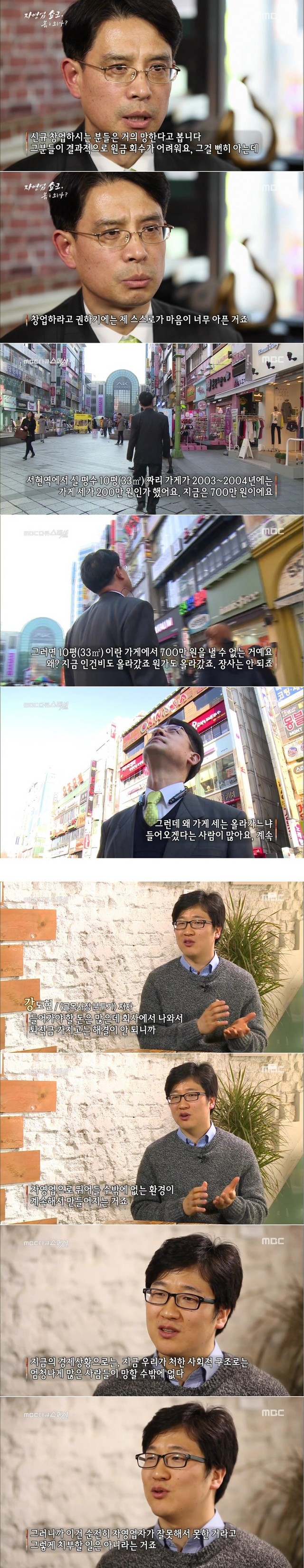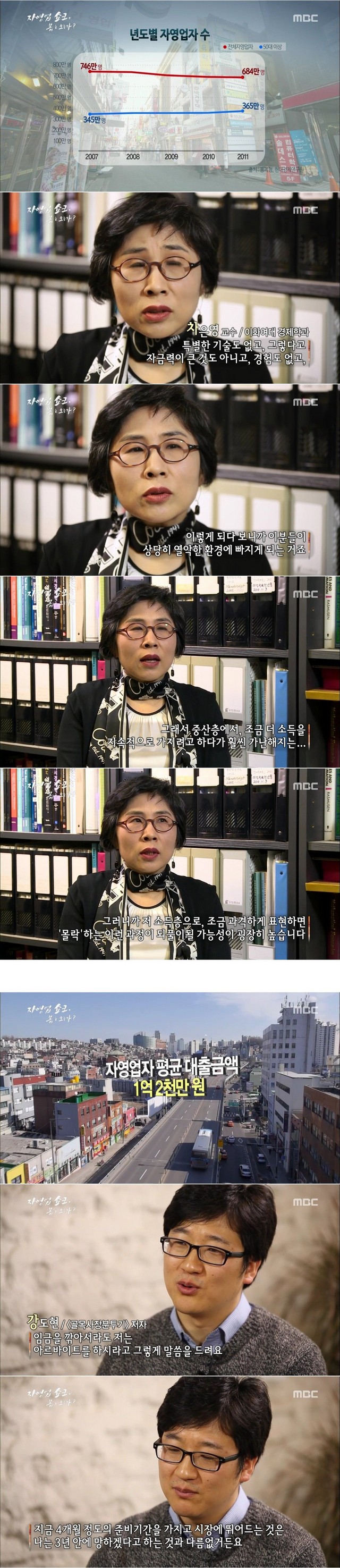 비전이 없습니다. 우리나라가 자영업 비율이 OECD중에서 최고입니다. 자영업 천국이라는 미국보다도 더 높은 비율이래요. 그 얘기인 즉슨 기업이 일자리를 안만들어주니까 비자발적으로 자영업으로 뛰어드는거에요. 이미 포화상태인 시장이 그런 어리숙한 신규자영업자를 가만 둘리가 없죠. 한마디로 이나라는 모험했다가는 홀딱 벗겨먹히는 수밖에 없는거죠. |